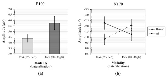 (a) Main effect of agent’s identity modality on changes in P1 (P100) amplitude and (b) interaction effect of agent’s identity type and modality on changes in N170 amplitude.