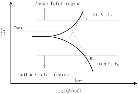 As can be seen from Figure 1, the Tafel curve is divided into two sections: the upper Tafel curve is the anode Tafel curve, and the lower Tafel curve is the cathode Tafel curve. The straight lines fitted by the anode Tafel curve and cathode Tafel curves will intersect at a point whose coordinate values are corrosion potential (Ecorr) and self-corrosion current density (icorr), respectively. The slope of the fitted straight line is ba and bc, respectively.