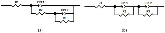 In Figure 2, R is an equivalent resistance of electrical components. CPE is a normal phase angle element, which is generally equivalent to a capacitor. R1 is electrolyte resistance, CPE1 is concrete capacitance, R2 is concrete resistance, and CPE2 is double-layer capacitance on the surface of the steel bars. R3 is the resistance of steel bars in concrete. The two equivalent circuit diagrams in Figure 2 are composed of three equivalent resistors and two constant phase angle elements. However, due to the different combinations of these equivalent elements, the impedances of two equivalent circuit diagrams are different. The corresponding impedances in Figure 2a,b are shown in Equations (2) and (3), respectively.