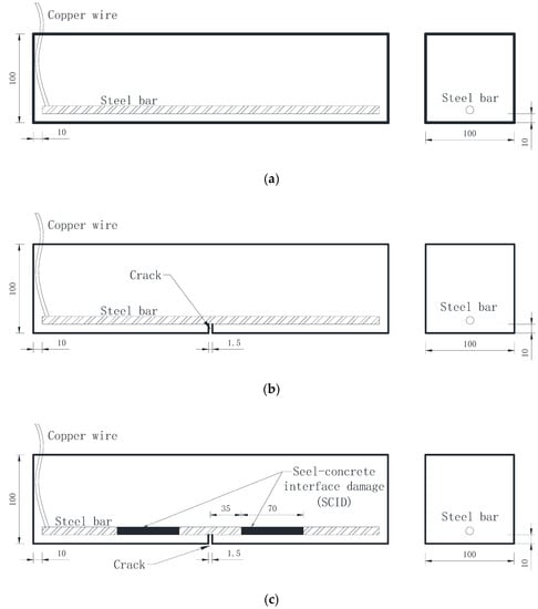 The cracks in Figure 4b,c were created by prepositioning. Prepositioning usually involves inserting a thin sheet of copper into the concrete and removing it before the concrete is fully hardened. However, cracks made by this method are easy to be filled with surrounding materials in the subsequent curing process, which will affect the accuracy of test results. In this paper, a wood sheet was used instead of a copper sheet. After the specimen was cured and molded, the wood sheet was taken out, which could avoid the test error caused by the preset copper sheet. The SCID in Figure 4 was achieved by wrapping filter paper on the surface of the steel bar.