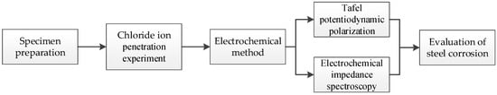 The test process was divided into the following steps: Firstly, BF was added to RPC to prepare BFRPC. Then, crack and SCID were treated as the typical deteriorated factor and applied for breaking the specimens. Next, the specimens were cured in steam at 90 °C for 48 h. In order to analyze the applicability and the steel corrosion behaviors of reinforced BFRPC in the seasonal frozen regions, the specimens were placed in 5 wt.% NaCl solution for chloride ion penetration experiment. The chloride ion penetration experiment was performed in one cycle every 7 days, and a total of four cycles were needed. At the end of each cycle, electrochemical methods were used to monitor and evaluate the corrosion of the steel bar in each specimen. The experimental procedure is shown in Figure 5.