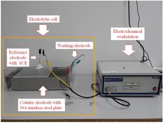 A three-electrode system is commonly used in electrochemical testing. In this paper, CS350H electrochemical workstation produced by Coster Co., Ltd. (Wuhan, China) was selected to conduct electrochemical testing with a three-electrode system. In the three-electrode system, the measured system contained the working electrode (WE), reference electrode (RE), and counter electrode (CE). The steel bars welded with copper wires are treated as WE. RE consists of SCE, saturated potassium chloride, agar, and a Luggin capillary. A 304 stainless steel plate with 400 mm × 100 mm × 1 mm was adopted as CE. The electrolyte used in this study is 3.5 wt% NaCl solution. The electrochemical experimental setup is shown in Figure 6.