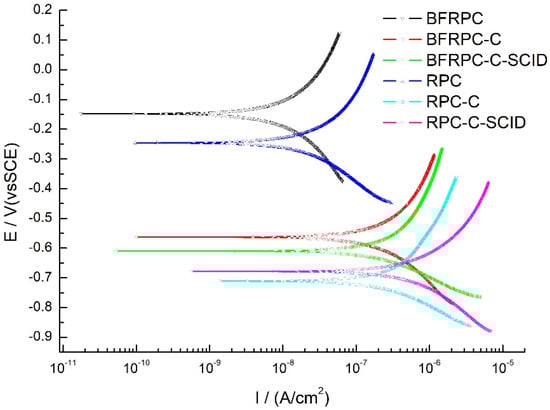 Generally, when the Ecorr was less than −0.275 V vs. SCE, there was a greater than 90% probability that steel bars in concrete structures were corroding [39]. Qualitatively, TPP curve moving in the negative direction of the Y-axis indicates that the corrosion resistance of the steel bar becomes poor. As can be seen from Figure 7, compared with the BFRPC and RPC specimens, the Ecorr of the BFRPC-C, BFRPC-C-SCID, RPC-C and RPC-C-SCID specimens move in a negative direction of the Y-axis and the Ecorr value is significantly less than −0.275 V, which indicates that the cracks weaken the corrosion resistance of the steel bars embedded in BFRPC-C, BFRPC-C-SCID, RPC-C, and RPC-C-SCID. Besides, under the same condition, the Ecorr of RPC specimen is more inclined to the negative direction of the Y-axis than that of the BFRPC specimen, which indicates that the corrosion resistance of steel bars in RPC specimen is weaker, and BF can increase the corrosion resistance of steel bars in BFRPC.