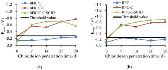 Corrosion potentials (Ecorr) for: (a) BFRPC specimens; (b) RPC specimens.