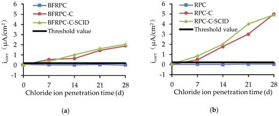 Self-corrosive current density (icorr) for: (a) BFRPC specimens; (b) RPC specimens.