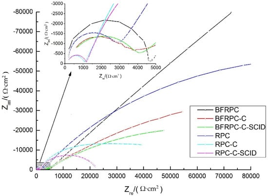 The Nyquist in Figure 10 were used to demonstrate the EIS results of steel bars embedded in the specimens. In Figure 10, the influences of BF, crack and SCID on the resistance of steel bars were analyzed by selecting data of the specimens with a chloride ion penetration time of 28 days. When the resistance of steel bars decreases gradually, the corrosion degree of steel bars increases gradually.