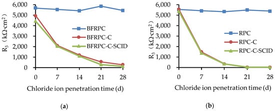 Polarization resistance R3 for: (a) BFRPC specimens; (b) RPC specimens.