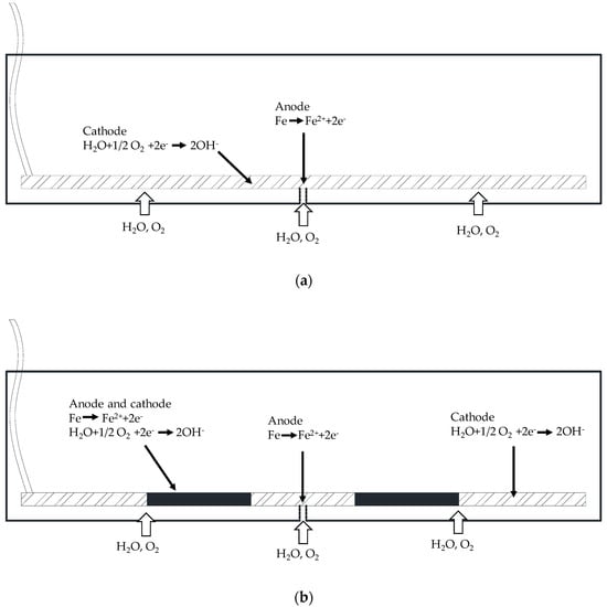 Corrosion mechanism of steel in conventional concrete: (a) crack, (b) crack and SCID.