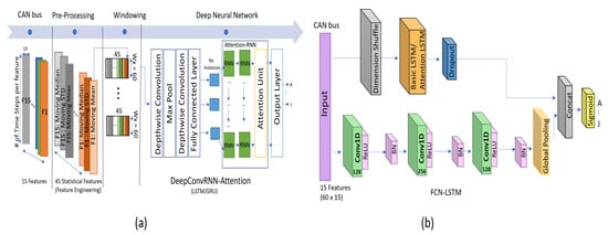 State-of-the-art deep-learning architectures for driver identification trained using the OCS Lab security dataset(CAN bus), (a) DeepConvRNN-Attention [7], and (b) FCN-LSTM [8].