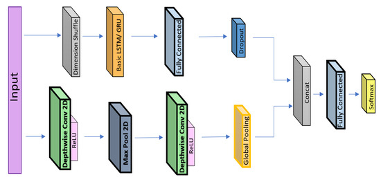 Similarly, the kernel sizes for the first and second depthwise convolutional layers are 9 × 1 and 5 × 1, respectively. However, to control the size of the network within a feasible range, a max-pooling layer is introduced between the depthwise convolution layers, as depicted in Figure 2. The kernel size is set to 7 × 1 with the stride of 1 × 2, thereby reducing the size and to overcome the over-fitting problem. The depthwise convolution layer was also used for similar applications in DeepConvRNN-Attention. However, the size of the network drastically increases because of adding × 2 LSTM layers (each having 128 hidden states) in sequential order (refer to Figure 1a). In our case, we replaced the 1D CNN with a depthwise layer whose configuration was similar to that of FCN-LSTM, and the LSTM layers were not augmented in sequential order (refer to Figure 1b). Subsequently, the LSTM/GRU layers of the proposed network also contain ten hidden neurons similar to FCN-LSTM.