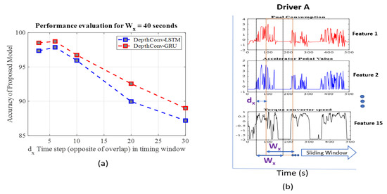 The data-segmentation or windowing step is critical to building an accurate driver-identification model. With regard to sequential or time-series data, determining the appropriate values of windowing hyperparameters (i.e., window size and degree of overlap) is the most crucial part, and it directly affects the model accuracy [45,46]. Hyperparameters, including the number of layers, kernel sizes in each layer, were explained in the previous Section 3.3.1. Here, we focus on the importance of window size and overlap. The input to the model depends on the window size(Wx), while the degree of overlap determines the prior information in the sequential data. The shift value dx is opposite to degree of overlap, which can be computed by using formula as overlap = Wx-dx, as depicted in Figure 3b. A study [7] was conducted to select the optimum values of both the Wx (90, 60, etc.) and dx (45, 10, 6, etc.); the best driver-identification performance was achieved for the window size (Wx) of 60 s and shift (dx) of 6 s, as shown in Table 2. Similarly, in FCN-LSTM, the authors selected the window size(Wx) as 60 and dx as 10. Our proposed model, being more compact than other algorithms, requires the values of these hyperparameters to be optimal to compete with the performances of other models. The best values were observed when the window size (Wx) was set to 40 s with a high degree of overlap (shift value of dx = 6 means overlap is 34, that is, 40 − 6 = 34), as presented in Table 2. Notably, a higher degree of overlap does not contribute to the network size; however, it affects the performance as shown in Figure 3a. We also evaluated our results for the window size(Wx) of 60 s and achieved optimum results when the value of dx is set to 10. However, the best value of dx is found to be 6, for window size (Wx) of 40 s. The visualization of windowing operation is shown in Figure 3b, where data from a particular driver A is segmented over time series using sliding window operation.