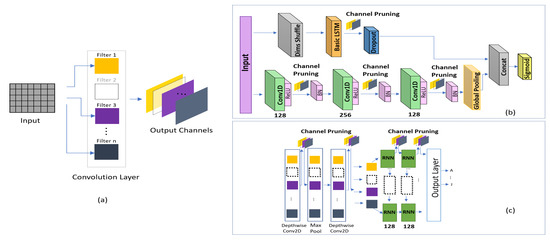 (a) Channel pruning. Locations where channel pruning was applied in (b) FCN-LSTM and (c) DeepConvLSTM-Attention.