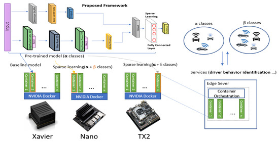 After training the network, we froze the best nodes of the last fully connected layer, as depicted in Figure 5 (see the dotted line). Each container could download the baseline model (the proposed adaptable model) and add new classes using sparse learning. Our container-based solution can be later deployed in the edge sever, where any type of container-orchestration method, such as Kubernetes or SWAM, can use the container as the fundamental block [37,38].The location of the edge server will be closed to the client (i.e., car in our case), and can be accessed through authorization (i.e., token, client certification) based on container orchestration system (i.e., Kubernetes, SWAM, etc.).