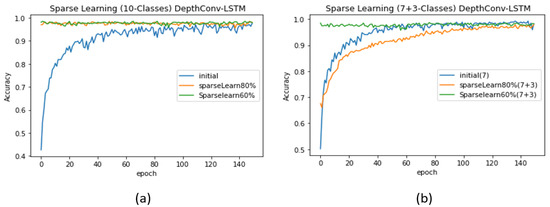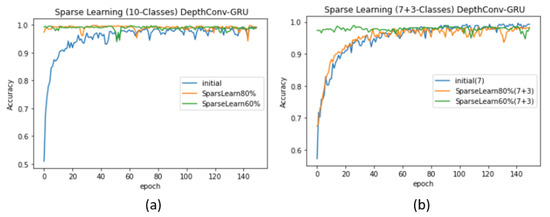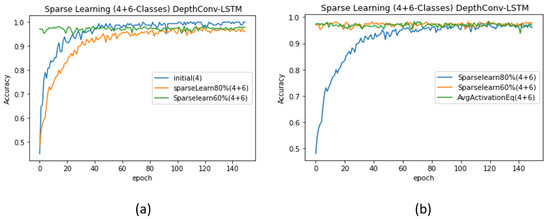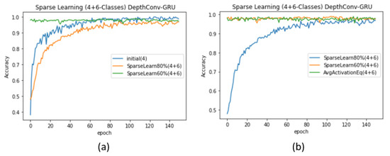 Figure 7. Performance evaluation (DepthConv-GRU) with and without sparse learning: (a) without introducing new classes and (b) with the introduction of a smaller number of classes than existing. - Case 2 ( < ): We repeat similar experiments for the case where there are more new classes () than existing classes (). However, in practice, this case can degrade the network performance [54]. This is because the pre-trained model can find difficulties in adjusting to an enormous amount of data as compared with the small amount of data previously used for training; thus, it may require major weight updates to achieve an acceptable accuracy. To resolve this issue, the authors in [54] proposed the following formula as an effective node-selection method:This formula was previously validated on LeNet, AlexNet, and VGGNet to adapt to up to 40% new classes without a significant loss in the accuracy corresponding to existing classes [54]. We exploited this formula for node selection in the fully connected layer of the proposed model. We retrained the nodes whose magnitudes ranged from 0 to the value obtained using the formula. Because all the nodes values were activated using ReLU, their magnitudes were greater or equal to zero. Accordingly, we retrained all the nodes that lied in this range and froze the remaining ones. When = 4, we obtained the initial test accuracy of 99.51% upon training only 4 classes (see Table 5). However, upon freezing the nodes according to the formula and feeding the network with data regarding +(4 + 6) classes, the accuracy suddenly dropped to 96.79%, which is lower than the original accuracy (97.86%) of the network when trained from scratch. Similarly, upon freezing 20% nodes using the previous ranking-by-magnitude method, we obtained a lower accuracy, that is, 96.37%. We achieved an accuracy of 97.86% upon freezing 40% nodes and re-training the rest using sparse learning. The corresponding validation accuracy curves for DepthConv-LSTM are depicted in Figure 8a,b. Similar pattern can be found in case of DepthConv-GRU as shown in Figure 9a,b.
