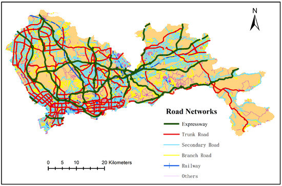 According to the classification and interpretation of the OSM road grade in Wikipedia [45], the road network data of the city of Shenzhen were extracted and divided into six categories: expressways, trunk roads, secondary trunk roads, branch roads, railways (including subways), and others (including cycle lanes, footpaths, and residential streets). The distribution of the road network is shown in Figure 2. As many roads were two-way roads, the subsequent calculation of the road network length would need to be repeated, which would affect the accuracy of the results. Therefore, we used ArcGIS software to extract the center line of the double line elements in the road network.