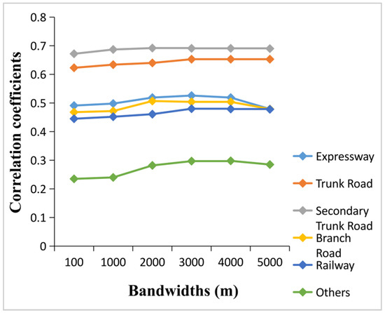 The kernel density estimation (KDE) method primarily estimates the density of a point or line pattern with the help of a moving cell (equivalent to a window) [46,47]. In KDE estimation, the determination or selection of bandwidth has a great influence on the calculation results. With an increase in bandwidth, the change of the point density in space is smoother but masks the structure of the density; when the bandwidth decreases, the point density becomes abrupt and uneven [46]. In specific application events, the value of the bandwidth is flexible, and experiments must be conducted according to the different bandwidth values. A default bandwidth is automatically generated, which is obtained by dividing the minimum bandwidth or length in the analyzed data layer by 30 in the ArcGis KDE. As the automatically generated bandwidth of each type of road network was different, we tested different bandwidths between 100 and 5000 m at an interval of 100 m according to the linear correlation between the total kernel density of each type of road network and the population in each township. As shown in Figure 3, the fluctuation of the correlation coefficient of all kinds of road networks was the smallest when the bandwidth was between 2000 and 4000 m. Ultimately, we chose 3000 m as the bandwidth for calculating the KDE of each type of road network, as their correlation coefficients with population were relatively high and stable.