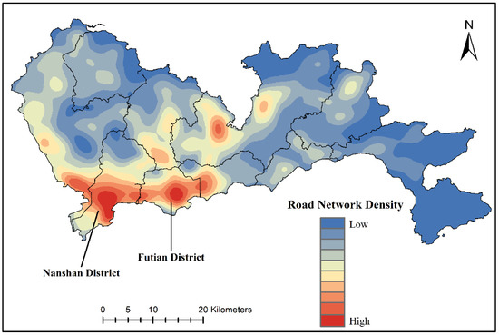 The weights of the expressways, trunk roads, secondary trunk roads, branch roads, railways and others were calculated as 0.2, 0.15, 0.08, 0.15, 0.21, and 0.2, respectively, through PCA. A composite RND image (Figure 4) was generated by overlaying six road network kernel density maps with their respective weights. The majority of the road networks in Shenzhen were concentrated in the southwest, particularly in Nanshan District and Futian District, and the road networks in the north and southeast were the sparsest. The distribution of the road network in Shenzhen was generally consistent with the NTL data.