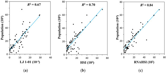 Scatterplots between the actual population at the township level and (a) the cumulative radiant brightness (RB) values of the LJ 1-01 NTL data, (b) the cumulative human settlement index (HSI), and (c) the cumulative RNAHSI at the township level in Shenzhen for the year 2018.