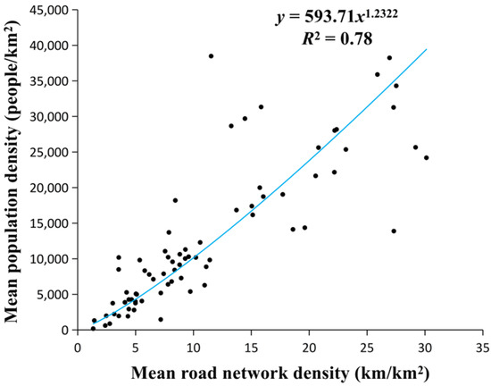 Based on the above analysis, to estimate the urban population distribution more accurately, we corrected the HSI using road networks to solve the problem of population underestimation in areas with dense road networks. The mean population density (i.e., the ratio of the total population to the area at the township level) and the mean RND (i.e., the ratio of the total RND to the area at the township level) were regressed. The results illustrate that they were distributed as power functions and highly correlated, with an R2 of 0.78 (Figure 6). Based on this, we took the RND as an important factor to improve the urban HSI, to correct the road networks of the HSI, and to obtain the RNAHSI. The improved formula is as follows: