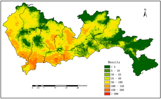 As the population model based on the HSI failed to further refine the structure of urban impervious areas, only the buildings were taken as the main body of the impervious surface, thus ignoring the significant impact of the RND on urban population distribution [52], particularly in modern cities, such as Shenzhen, with a high RND. In the city, the communication and transportation between materials and residents rely on roads. The higher the density of the road network, the better the accessibility of the road and the more attractive it is for residents to live; at the same time, the more residents that move in, the more appropriate the road traffic will be for the travel of residents, and the density of the road network will be further improved.