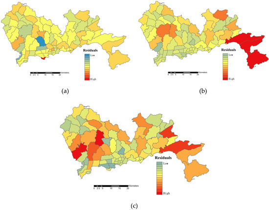 Township-level distribution of the residuals of the predicted population using (a) the RNAHSI, (b) the HSI, and (c) the WorldPop dataset.