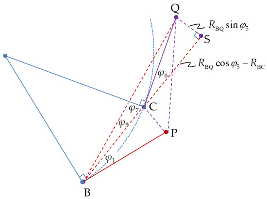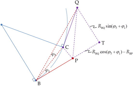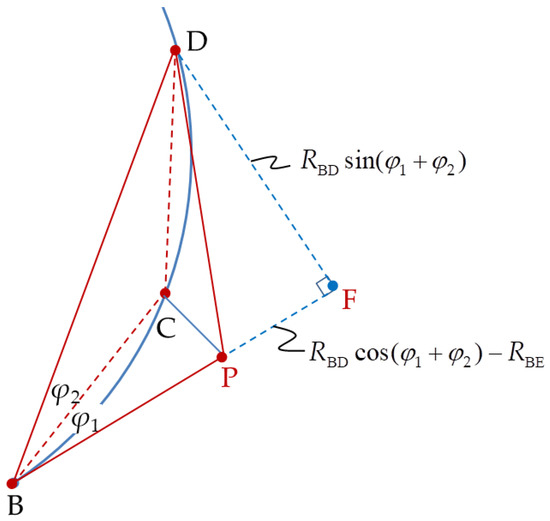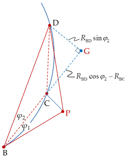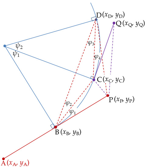By considering the position of points C and P relative to point B, a Cartesian coordinate system labeled x and y with its origin at point B can be introduced as shown in Figure 2. Equations (1)–(4) define the distances in terms of xi and yi.