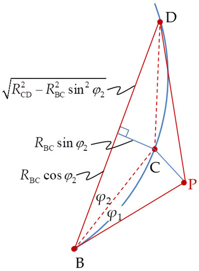 In order to extend the proposed algorithm from two to three dimensions, the prediction, Equation (9), can be interpreted as a vector quantity. Define the vector of length RBC pointing from point B towards point C, and vector , respectively by considering the cross product performed in a two-dimensional plane.