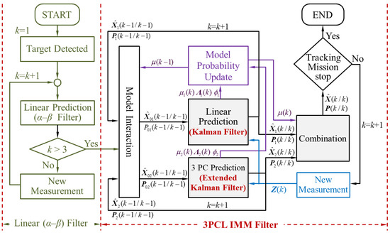 The algorithm flow-chart of the 3PCL IMM filter is shown in Figure 8. The entire operation process can be divided into two parts, namely: simple linear filtering and IMM filtering. When the number of target position samples is less than three points, the linear filtering method can only be used, because the number of target information required for the circular prediction calculation has not been satisfied. In addition, the proposed algorithm uses linear prediction (α–β filter) to track the target when . It is assumed that there is only one target in the calculation process, and the trajectory correlation is not considered. When the target position samples are more than three points, the IMM hybrid filtering operation can be started.