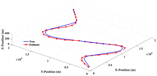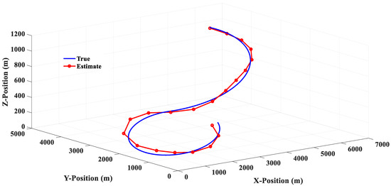 The estimated responses of different filters to scenario 1 are shown in Figure 10, Figure 11, Figure 12 and Figure 13. Figure 14 shows the estimated errors of different filters. The α–β filter is a first-order (linear) filter. In the calculation, the position of the next moment is predicted linearly according to the position of the previous moment and the current moment. Although the calculation mechanism is relatively simple, a steady-state tracking error is generated when tracking a nonlinear moving target, as shown by the simulation results in Figure 10. Figure 14 also shows that when the lateral acceleration of the target is 3.5 G and −7.0 G respectively, the steady-state tracking error of the α-β filter is about 350 m and 700 m respectively, which indicates that the greater the lateral acceleration is, the greater the steady-state tracking error of the α–β filter will be.