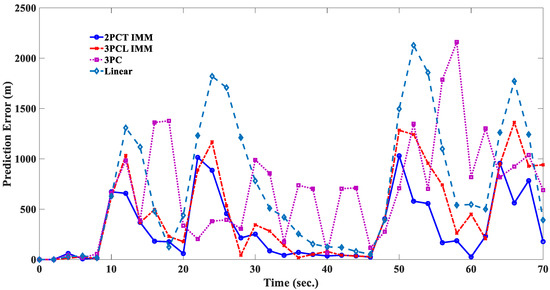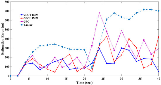 Scenario 2 is composed of four groups of straight lines combined with turning trajectories. Figure 15 shows that the linear filter has a good estimation performance for linear motion, but there is a large estimation error when the target makes a turn. Figure 16 shows that the estimation response of 3PC circular filter will oscillate when the target trajectory is changed from linear motion to circular motion, and then to linear motion. This phenomenon is due to the fact that 3PC circular filter needs to calculate the prediction position by using the past three measurements. Therefore, the filter cannot respond quickly for the target that changes direction instantaneously. Figure 17 illustrates that the 3PCL IMM filter has less estimation error than the linear filter when the target turns to the change direction. Compared with the 3PC filter, the 3PCL IMM filter has a relatively small oscillation in the estimated response. Figure 18 shows that the 2PCT IMM filter proposed in this paper has a smaller estimation error than the 3PCL IMM filter when the target is to change the direction of motion. In addition, the oscillation of the estimated response is also very slight. Figure 19 shows the comparison of the estimation errors under the condition of Scenario 2 for different type filters. It shows that the linear filter has a larger estimation error than other estimators. After the target suddenly changed the direction at each way point, the 3PC circular filter has a larger estimation error than 3PCL and 2PCT IMM filters, and the estimation error variations are more drastic. In addition, we observed that the 3PCL IMM filter has a larger estimation error than the 2PCT IMM filter, and the variation of the estimation error is also large, which means that the 2PCT IMM filter has a better estimation performance than the 3PCL IMM filter.
