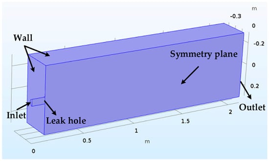 There has been a lot of simulation and experimental studies on the prediction of pneumatic jet noise [30]. In this paper, the CFD simulation software COMSOL is used to establish a 2000 mm × 600 mm × 600 mm rectangular flow field. The RNG k-ε turbulence model is adopted. The leak hole is circular and set at the center of the cross-section. The diameters are 20, 60, 100, and 140 mm, respectively. The inlet boundary condition of the flow field uses velocity inlet with 10, 20, 30 and 40 m/s, respectively. The outlet boundary condition is a pressure outlet, and the other boundary conditions of the surfaces are nonsliding wall surfaces. Because the flow field is uniformly axis-symmetric, to improve the calculation efficiency, the flow field is cut along the XOZ plane, and one half is taken for the simulation analysis. The cutting surface is set as symmetric boundary conditions, as shown in Figure 1.