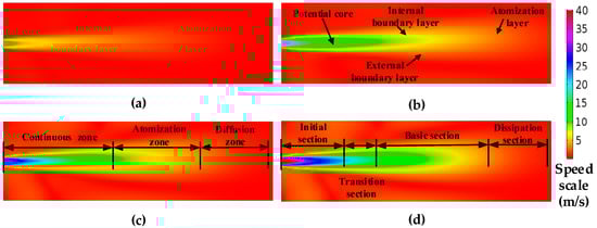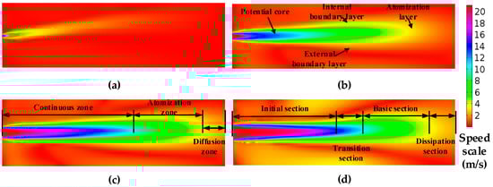 Steady-state flow field velocity cloud map with different jet velocities (leakage hole 60 mm). (a) 10 m/s; (b) 20 m/s; (c) 30m/s; (d) 40 m/s.