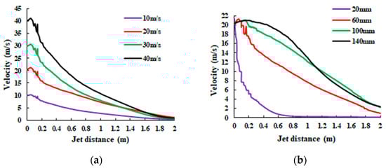 The variations of the jet centerline velocity with different inlet velocities and different leakage holes are shown in Figure 4.