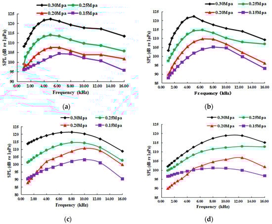 A-weighted 1/3 octave processing and Gaussian quadratic fitting were performed on the denoising sound pressure signal. Figure 15 shows the sound pressure level (SPL) of different leakage pressures with a 45° jet direction and 2 m distance.