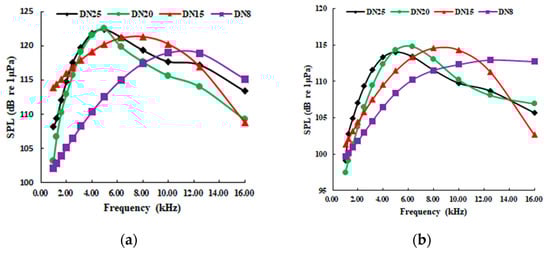Figure 16 shows the sound pressure level of different leakage diameters with a 45° jet direction and 2 m distance. It can be seen that: (1) The center of the spectrum is related to the leak diameters, but its amplitude is not greatly affected by the leak diameters. (2) Under the same pressure condition, the effect of leak diameter on the amplitude of the radiated noise SPL is very little. For example, the peak difference does not exceed 6 dB when the diameter varies from DN8 to DN25. (3) On the compact sound source, with the increase of the leakage hole diameter, the frequency bandwidth of the radiated noise becomes narrower, and the center of the spectrum moves toward the low-frequency direction. This phenomenon is similar to the situation when the pressure increases.