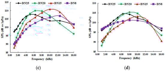 Radiated sound pressure levels under different leakage pressure. (a) DN25; (b) DN20; (c) DN15; (d) DN8.