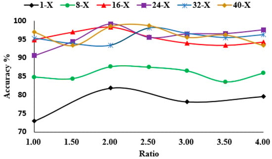 In the experiment, different combinations of structure collocation were investigated. In Figure 17, the model has a high accuracy rate only when the number of convolution kernels in the first layer is greater than or equal to 16, and the second layer has twice as many kernels as the first. As a result, considering the balance of the performance and efficiency, the architect of CNN was set as in Table 3.