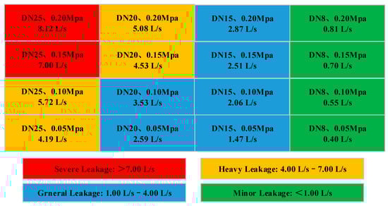 The experiment used leakage pressure and leakage caliber as variables, and the pressure in the pressure tank varied from 0.15 to 0.30 MPa. The nominal diameters of replaceable leak pipelines are shown in Table 2.