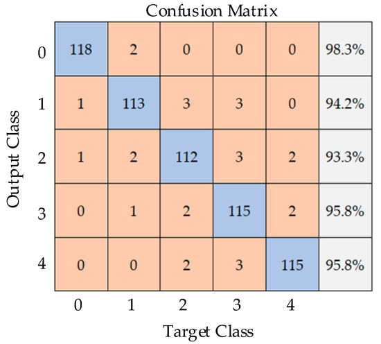 In this study, we collected 3800 fault samples in a single leak and divided them into five groups (i.e., four leaked samples and one nonleaked sample) according to the degree of the leak, as shown in Figure 18. There are 760 samples in each group. Each type has 540 training samples, 100 validation samples and 120 testing samples.
