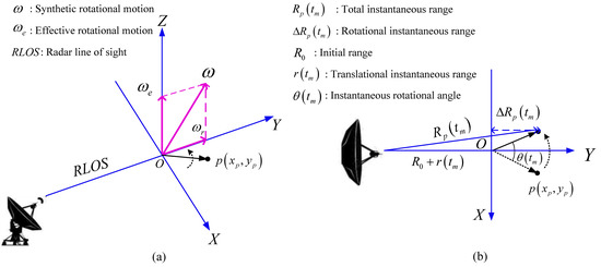 The motion compensation can be divided into two parts: range alignment and phase autofocus. Generally, the range alignment is completed first followed by the phase autofocus. The commonly used range alignment algorithms include the maximum cross-correlation method [11] and the minimum entropy method [12]. This paper employs an improved maximum cross-correlation method (IMCM) [8] to achieve range alignment. This algorithm works out the weighted sum of all the aligned envelopes, which replaces the adjacent echoes in the traditional maximum cross-correlation method as the reference in the cross-correlation operation; thus, it has good robustness. In terms of phase autofocus, methods such as the multiple dominant scatterers method [13,14], the phase gradient autofocus algorithm (PGA) [15,16,17] and the minimum entropy method [18,19] are frequently adopted. In this paper, we use PGA to realize phase autofocus in light of its strong practicality and low computational complexity. The algorithm compensates the phase errors of the whole echo signal by calculating the phase gradient of the dominant scatterer. That is to say, the dominant scatterer (usually the composite point of multiple dominant scatterers) is regarded as the rotational center and recorded as the equivalent rotational center (ERC). It is easy to know that, after the processing of PGA, the ACR of the echo signal is no longer linear with the range coordinates of the scattering points, which renders the azimuth scaling algorithm based on the ACR invalid. In addition to the cascaded motion compensation method above, a joint translational motion compensation algorithm is proposed in [20]. The algorithm is highly robust against noise but not suitable for the non-coherent mode of the motion errors; thus, its practicality is poor. Furthermore, the aforementioned motion compensation algorithms only consider the same motion errors of all scattering points and neglect the exclusive range spatial-variant phase errors of different scattering points caused by the target’s rotational motion [21,22]. Thus, it is desired to advance an algorithm by jointly estimating the equivalent rotational center position (ERCP) and effective rotational velocity (ERV), which can achieve the range spatial-variant autofocus while precisely accomplishing azimuth scaling.
