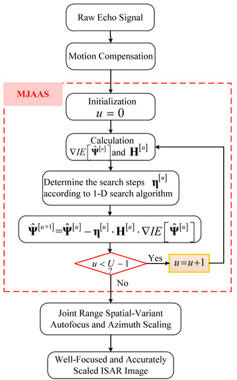 (2) Based on the JERCP-ERV signal model, MJAAS is proposed. In this technique, the Davidon-Fletcher-Powell (DFP) [23] algorithm is used to solve a minimum entropy optimization problem, thereby jointly realizing the accurate estimation of ERCP and ERV. Furthermore, the precise range spatial-variant autofocus and azimuth scaling can be simultaneously completed on the basis of the estimation results. It is noteworthy that the application of MJAAS is not limited to certain types of motion compensation algorithms. MJAAS can jointly achieve accurate azimuth scaling and range spatial-variant autofocus by estimating the corresponding ERCP and ERV with regard to different motion compensation algorithms.