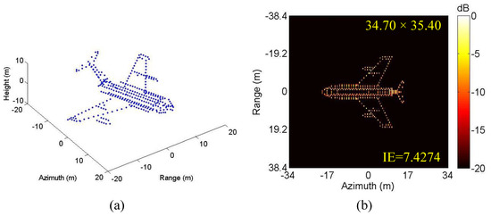 Simulated data of Yak-42 airplane. (a) 3-D scattering point model. (b) Standard ISAR image.