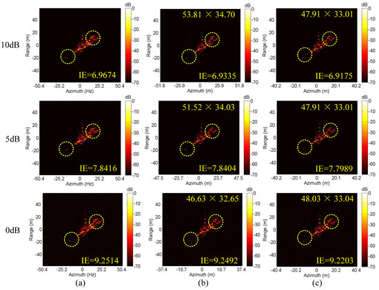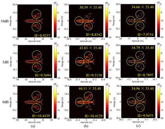 The imaging results of different algorithms at different SNRs. (a) IMCM-PGA. (b) IMCM-PGA-TAS. (c) IMCM-PGA-MJAAS.