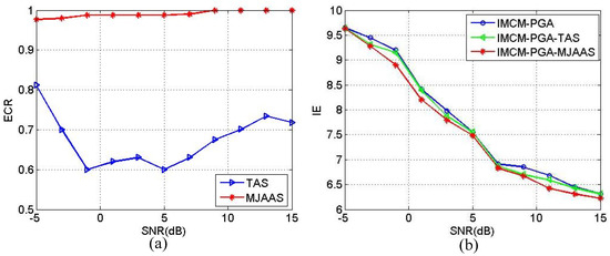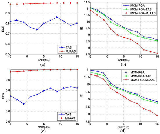 where denotes the theoretical value of ERV and the estimated value of ERV. With other conditions unchanged, SNRs range from −5 dB to 15 dB in step of 2 dB. The Monte-Carlo experiment is implemented 20 times at each SNR, and the resulted average values of ECR and IE in 20 experiments are calculated and plotted in Figure 8. Figure 8a reveals the average values of ECR obtained by IMCM-PGA-TAS and IMCM-PGA-MJAAS in CM, and Figure 8b shows the average values of IE obtained by IMCM-PGA, IMCM-PGA-TAS and IMCM-PGA-MJAAS. Figure 8c,d are the results achieved in NCM. From Figure 8, the proposed algorithm can obtain higher ECRs and lower IE at different SNRs than the comparison algorithms no matter in CM or NCM. Therefore, the superiority of the proposed algorithm is quantitatively corroborated.