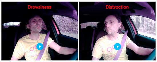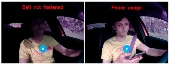We developed a software framework to support these use cases. The driver can record a video in vehicle cabin and then check it using the framework. The framework utilizes the Faceboxes neural network model [52] to detect the driver’s face and the Dlib framework to detect facial landmarks. Based on these landmarks, the drowsiness and distraction use cases are detected (Figure 3). For the unfastened belt, eating, drinking, smoking, and smartphone use cases (Figure 4) we developed a neural network model based on the YOLOv3 framework and a dataset that currently includes more than 3000 images of drivers in vehicle cabin. We use Java programming language to develop the cross platform prototype for the smartphone-based video analysis.