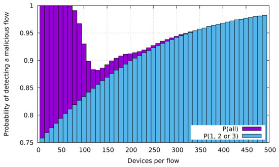 Appendix A.1. Probability of a Flow with Malicious Devices to Be Detected in Specific Scenarios