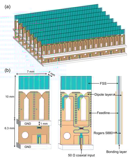 The proposed TCDA with feeding networks and FSS superstrate is shown in Figure 1a. The element configuration is presented in Figure 1b, which is implemented using double-layer PCB laminating technology. Three copper layers are hosted by two Rogers 5880 () substrates of 10 mil thickness each. These layers are laminated together using a 4-mil-thick polyflon material. Two dipole layers are printed on the opposite sides of the substrate, and the FSS together with the feedline is placed in the middle layer. Such sandwich structure constitutes a stripline feeding network. The array consists of two radiators per unit cell, each of which contains a pair of parallel dipoles. As emphasized later, it is critical for the impedance transformation of the array. Two ground planes are employed, the top one serves as a reflector for the dipoles, and the bottom one is used to hold the coaxial connectors. The distance between them should be small enough to produce a low profile.