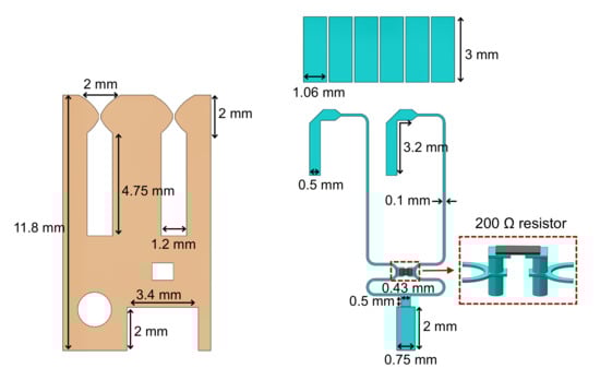 Figure 2 illustrates key details of the front dipole layer and the feeding network, including basic dimensions. An exponent-shaped dipole is chosen as the element itself has good radiation characteristics. The feeding structure is composed of a Marchand balun and a Wilkinson divider. To facilitate the installation of the isolation resistor, a slot is cut in the front metal layer. Two plated-through vias are introduced to connect the resistor and stripline within the Wilkinson divider. A square groove with size is machined in the substrate together with the front metal layer printed on it, to facilitate the soldering of the coaxial connector and the middle feedline. The input port of the Wilkinson divider contains a transition from coaxial line to microstrip to stripline. A 200 surface mount chip resistor is used to provide power-divider isolation.
