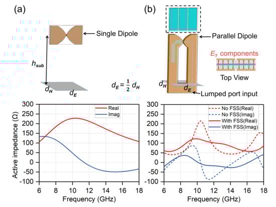Figure 4 presents the preliminary design of the array element. A unit cell of the infinite single-dipole array fed by a lumped gap source is shown in Figure 4a. The gray rectangle represents the metal ground. The distance from the dipole to the ground is 5.5 mm, the dipole width is 2 mm, and 3.5 mm. The unit cell was simulated under periodic boundary conditions, which can indicate the infinite array performance. The simulated results indicate that the real active input impedance at the resonance point reaches up to 200 , which is about half of the wave impedance of the free space. And the impedance curves change a lot over the observation frequency band, which are very detrimental to realize wideband impedance matching. Then one more dipole was added to the opposite side of the dielectric substrate, constituting a parallel-dipole form, as shown in Figure 4b. The E-plane element spacing is still halved, and the detailed dimensions keep the same with the single-dipole counterpart. A stripline-based Marchand balun is employed to feed this dipole pair. By comparing the simulated results, we can find that the average active input resistance drops to 100 , though still with large fluctuations. The capacitive coupling introduced by the parallel combination of the dipole pair, cancels out the ground plane inductance at low frequencies. An FSS structure was further placed over the dipole element to improve matching. After that, the real part of the impedance flattens out near 100 , and the imaginary part is stable around 0 over the operating band.
