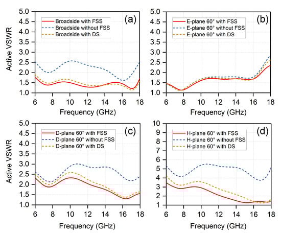 The electromagnetic simulations of the unit cell with DS were carried out. Figure 7 compares the active VSWR of the infinite arrays without superstrates, with the FSS superstrate, and with equivalent DS at different scanning angles. Without FSS or DS, the active VSWR deteriorates when scanning to the broadside and 60 in the H-/D-planes. The solid red curves and dashed yellow curves are very close, which indicates that the FSS superstrate and equivalent DS have similar capabilities at different scanning angles. In addition, the FSS superstrate is even more effective than the equivalent DS. The FSS superstrate is especially helpful for the H-plane scan, since the active VSWR is much higher when scanning to H-plane 60 for the case of without FSS